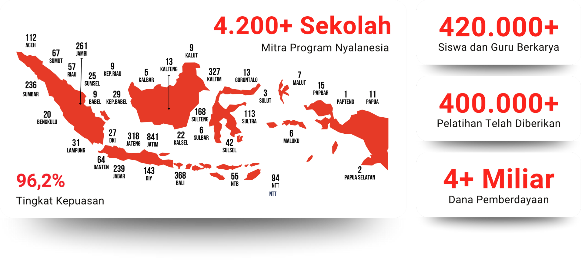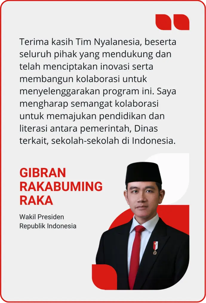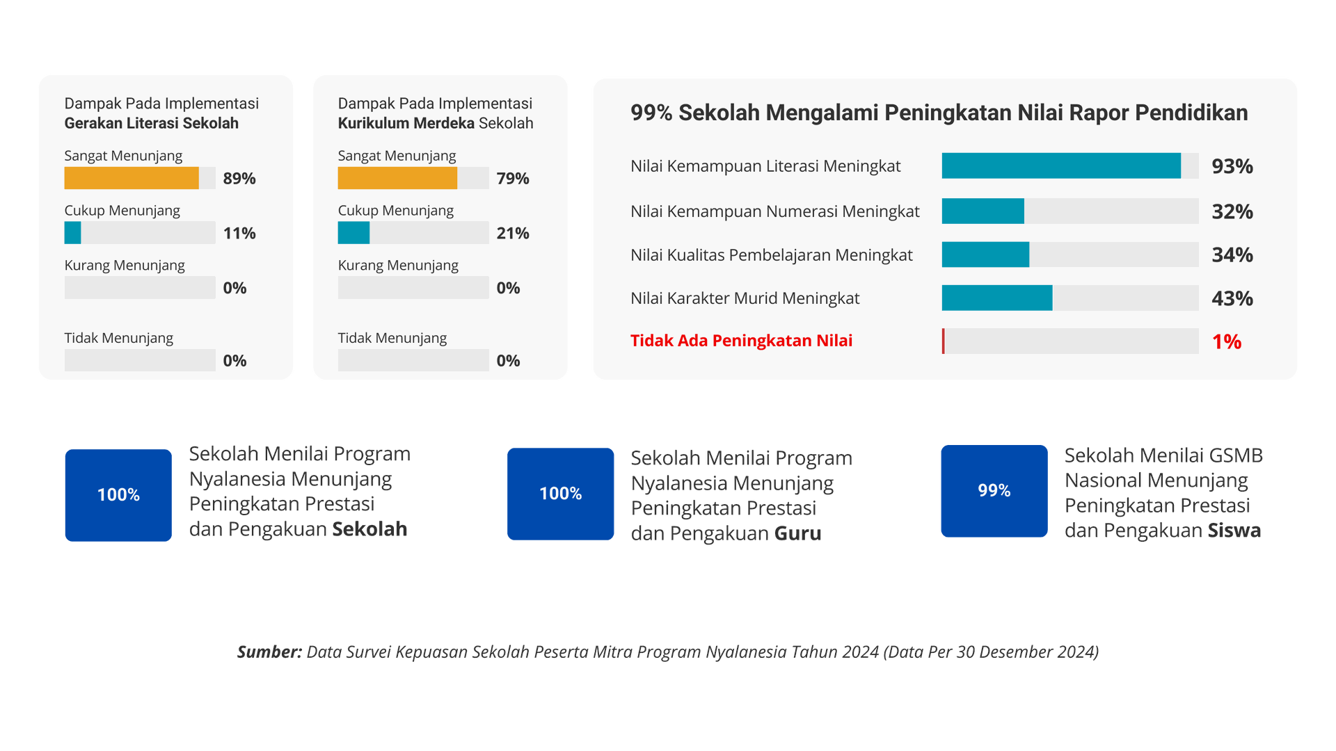 Ratusan sekolah telah mengikuti program Sekolah Literasi Nasional yang diselenggarakan oleh Nyalanesia. Berdasarkan hasil Survei Kepuasan Peserta, program ini terbukti berdampak, dan memberi manfaat bagi ratusan sekolah peserta. Berbagai manfaat itu di antaranya meningkatkan Rapor Pendidikan Sekolah; menunjang implementasi Gerakan Literasi Sekolah, Project Based Learning di sekolah; hingga menunjang peningkatan prestasi dan pengakuan sekolah, guru, dan siswa.
