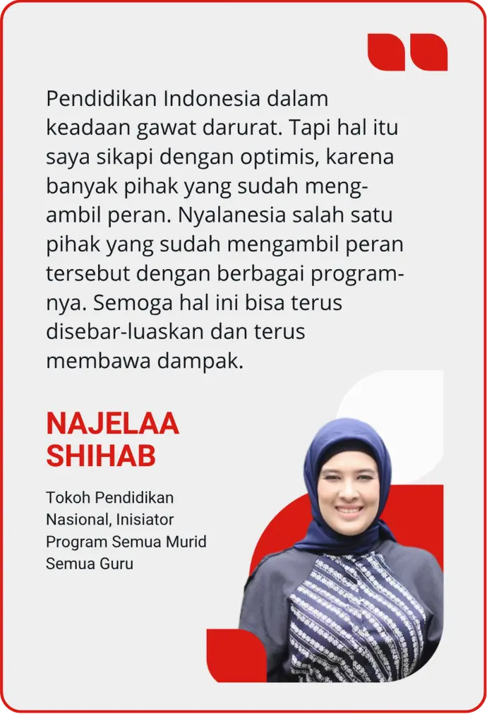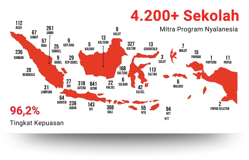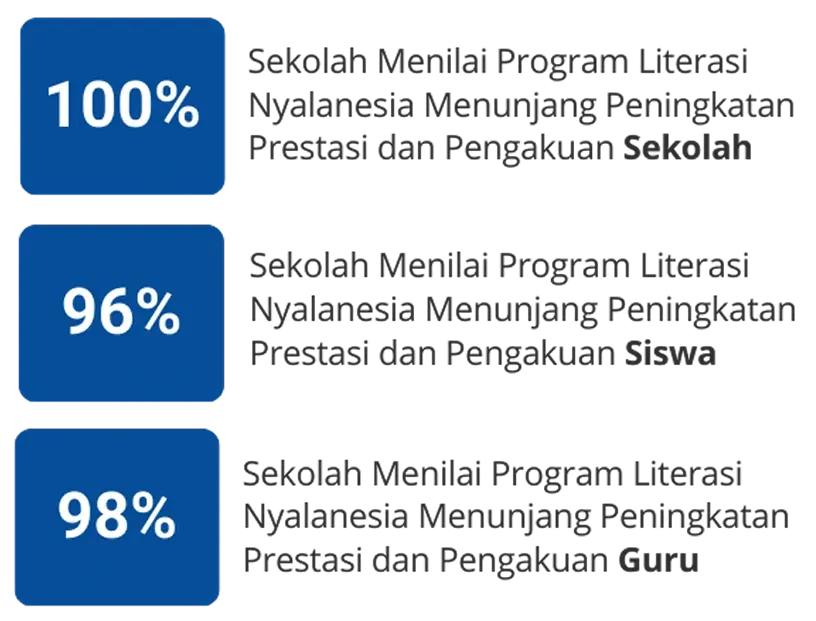 Ratusan sekolah telah mengikuti program Sekolah Literasi Nasional yang diselenggarakan oleh Nyalanesia. Berdasarkan hasil Survei Kepuasan Peserta, program ini terbukti berdampak, dan memberi manfaat bagi ratusan sekolah peserta. Berbagai manfaat itu di antaranya meningkatkan Rapor Pendidikan Sekolah; menunjang implementasi program Literasi Dasar, Gerakan Literasi Sekolah (GLS), serta implementasi Project Based Learning dan 8 Dimensi Profil Lulusan dalam Pembelajaran Mendalam; hingga menunjang peningkatan prestasi dan pengakuan sekolah, guru, dan siswa.